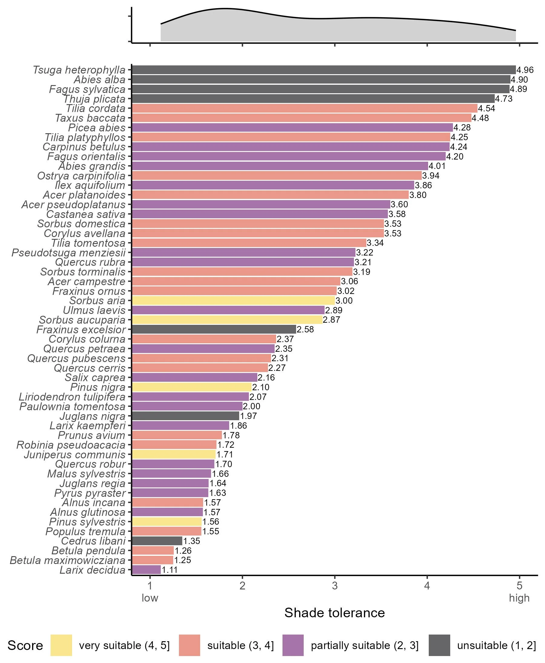 Shade tolerance of 53 tree species. Colours represent each species’ suitability score on a scale from 1 to 5 (Thom et al., 2026). The frequency distribution shown above the figure suggests that shade tolerance among the assessed species is relatively evenly spread, with a slight concentration toward the lower end of the tolerance scale.