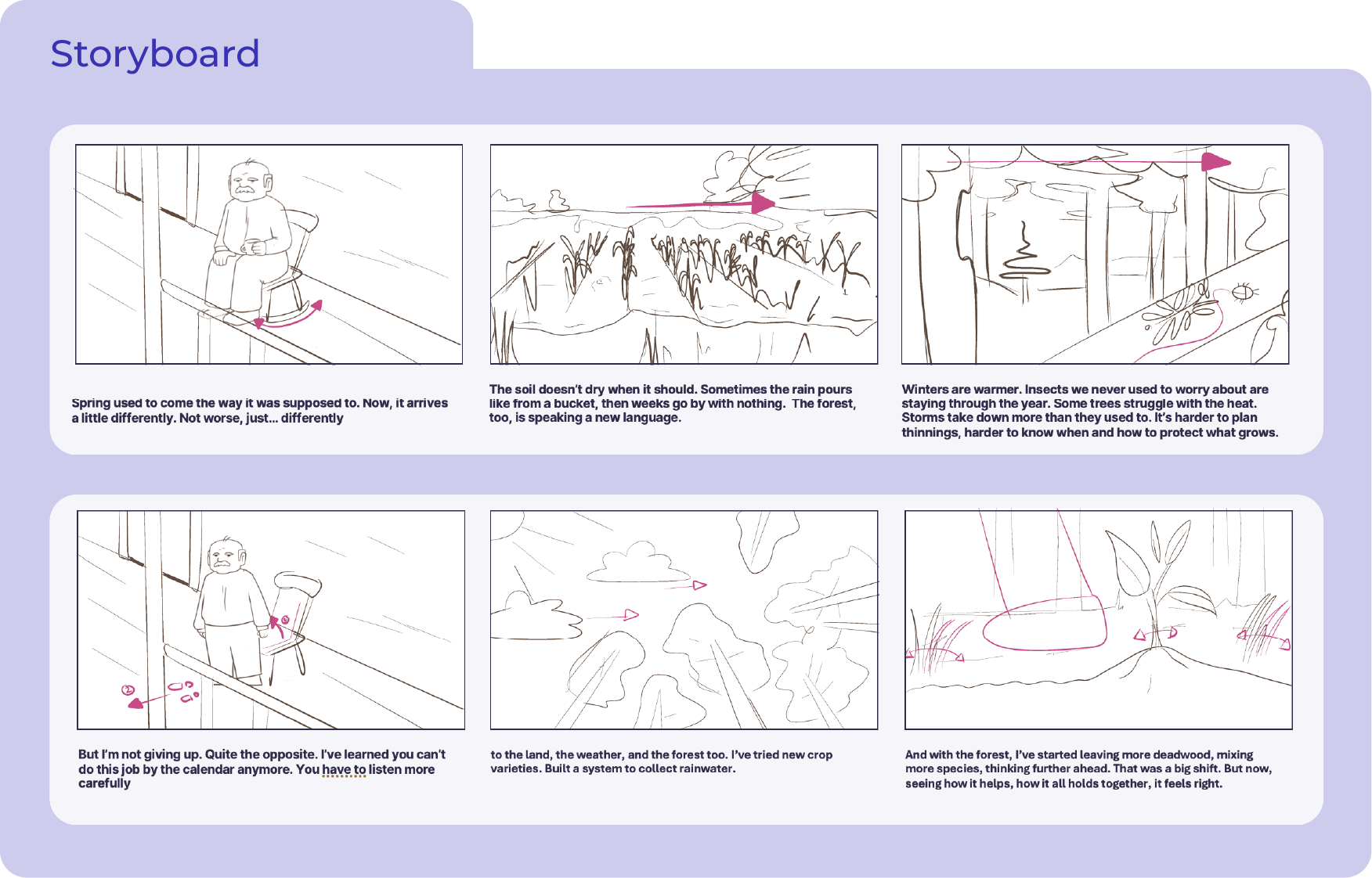 The storyboard shows Aarne sitting on his porch, contemplating his farm and it’s future. We see the challenges he is facing due to the changing climate, and some of the solutions he has tried. As the story unfolds, we learn he is waiting for his daughter to arrive so they can attend a Precilience workshop together. This was a simple visual story to support the narration and show some imagery familiar to Precilience partners and stakeholders.