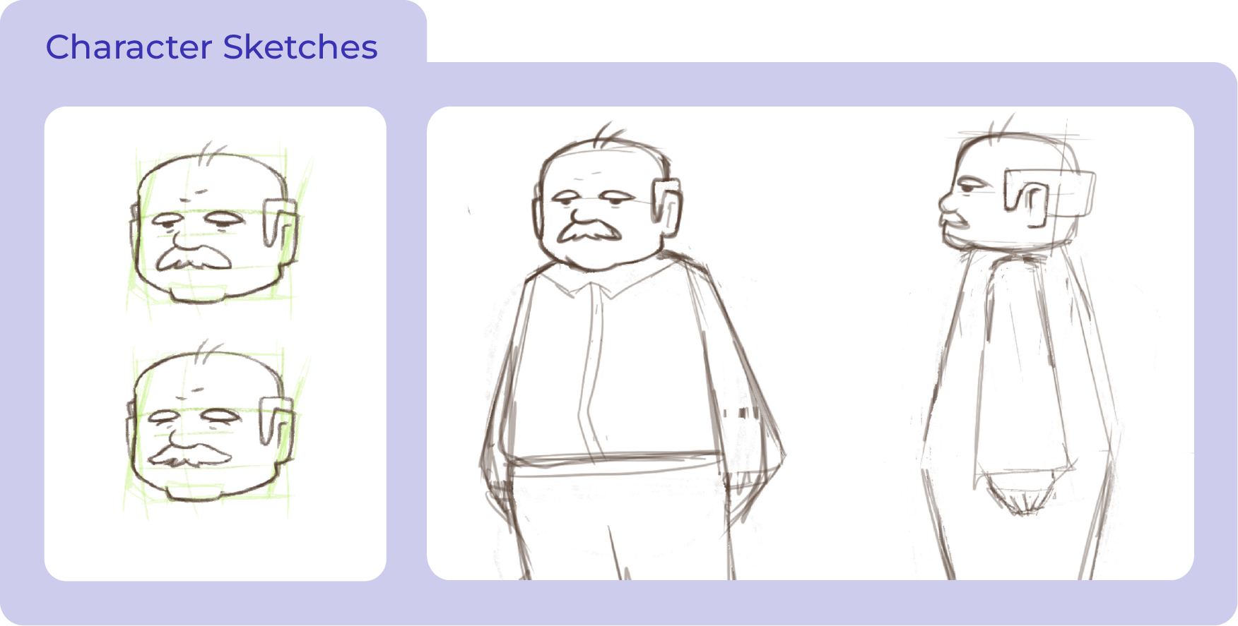 The goal for the visual characterisation of Aarne, an aging father, was to create a character who feels familiar and warm and would resonate with the viewer. His appearance should reflect his life’s work on the farm, being a father, and his hope for the future.